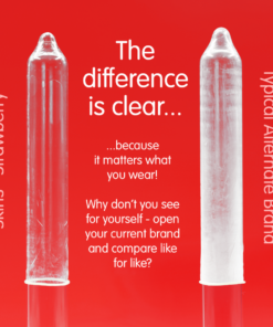 Introducing our new Strawberry 4-pack, featuring a sleek, ready-to-use design and up to 33% more condoms than the market leader. Add a classic fruity flavor to your product range with Skins Strawberry condoms. Made with premium natural latex for a sheer, natural feel, these condoms are designed to provide a second-skin feel without compromising strength or safety. Ideal for retailers looking to offer a popular and trusted flavor option for added intimacy and protection.