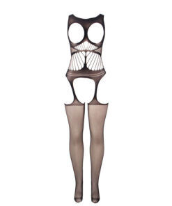 - Style: Black fishnet bodystocking with crotchless design, with bare chest and shoulders.