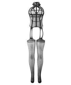 - Style: Black fishnet bodysuit with high neck, elegant and bold design.